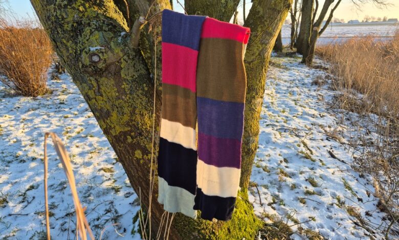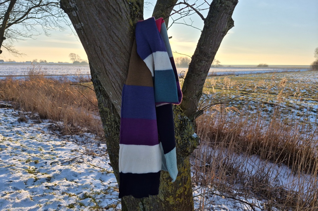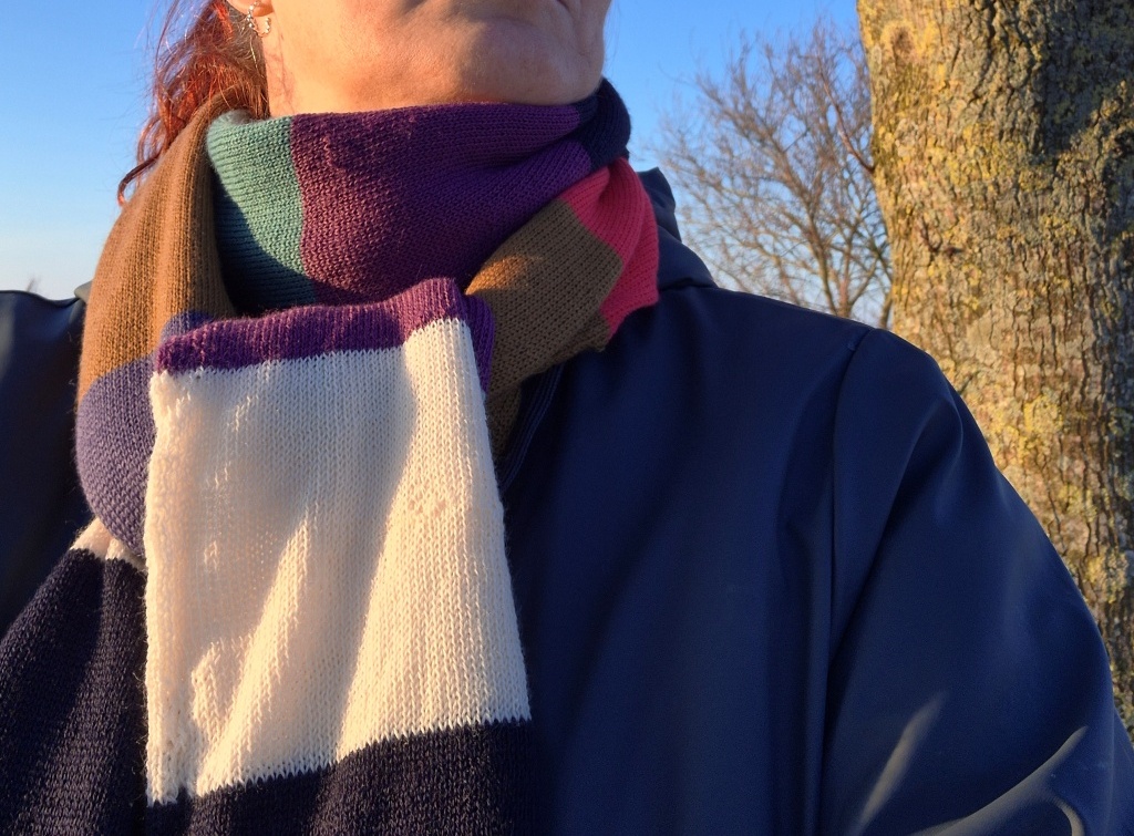Dette halstørklæde er hurtigt og nemt at strikke, der bruges både hoved- og ribapparat så der strikkes rundt i glatstrik. Striberne strikkes i brede baner og i forskellige farver – her er de sammensat lidt tilfældigt men kan sagtens sammensættes i et mere afstemt mønster og farvepalette.