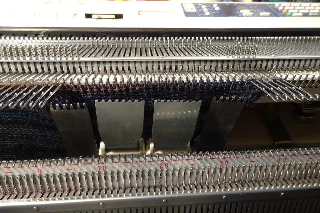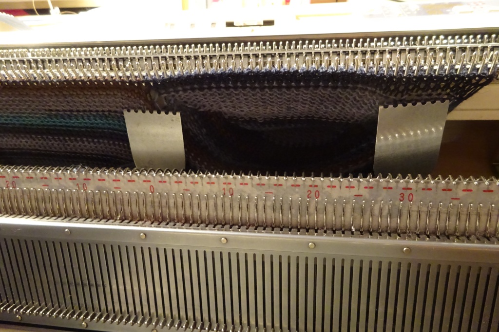Når alle maskerne er i strikkeposition igen, indstilles slæden til N og der strikkes 8 rækker over alle masker med restegarn. Sokken er nu færdig.