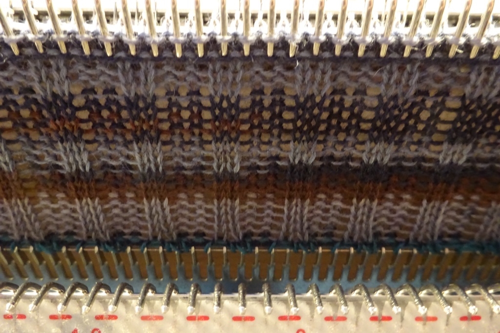 Nu strikkes modsat, det vil sige at nålene som er sat i hvilestilling tages med ind i strikningen igen. Dette gøres på denne måde: